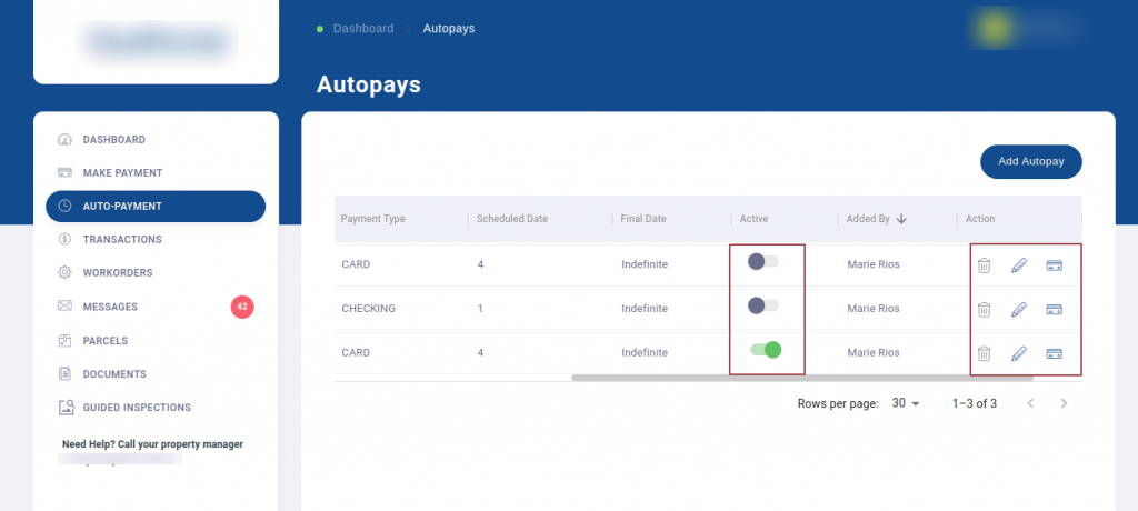 Once autopayments are set up, residents can view them under the Auto-Payments section of their resident portal. From the Auto-Payment page residents are able to turn autopays on and off, delete, edit or update the card or ACH if needed.