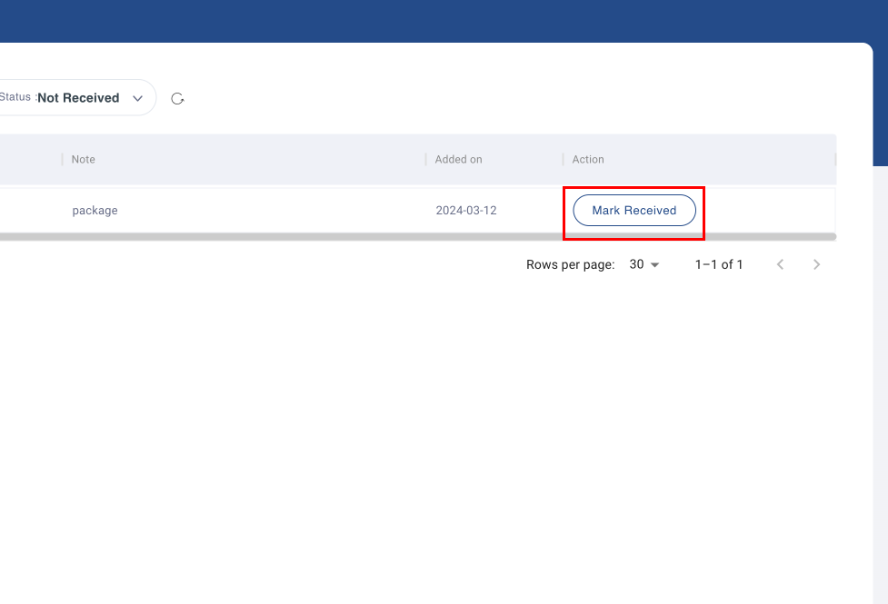 Once a package is delivered, or picked up, the resident can mark the package as received using the Mark Received button.