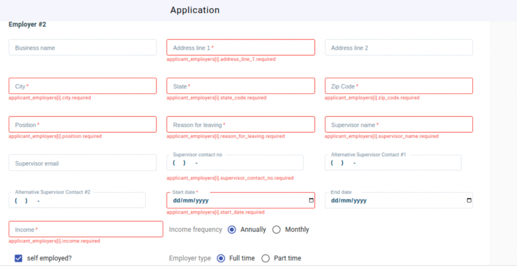 - Then indicate the income frequency, employer type, and self employed and current status.
