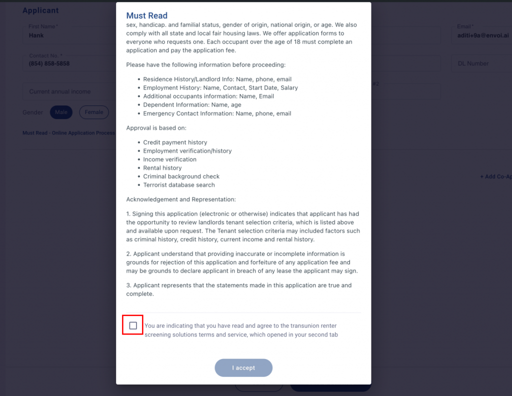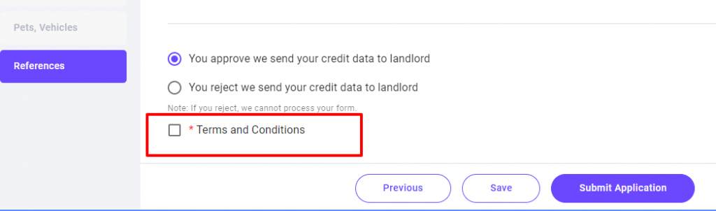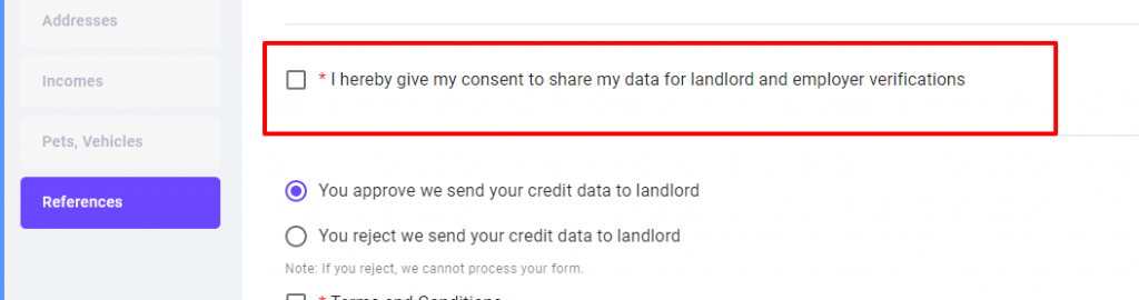 - You must click to approve that your credit data will be sent to the landlord. If you choose to reject it, the form will not process.