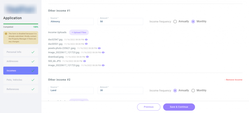 4. Other Income: This is an optional field, you can add any other sources of income that you want considered in the rental process. You can add more than one, as needed.