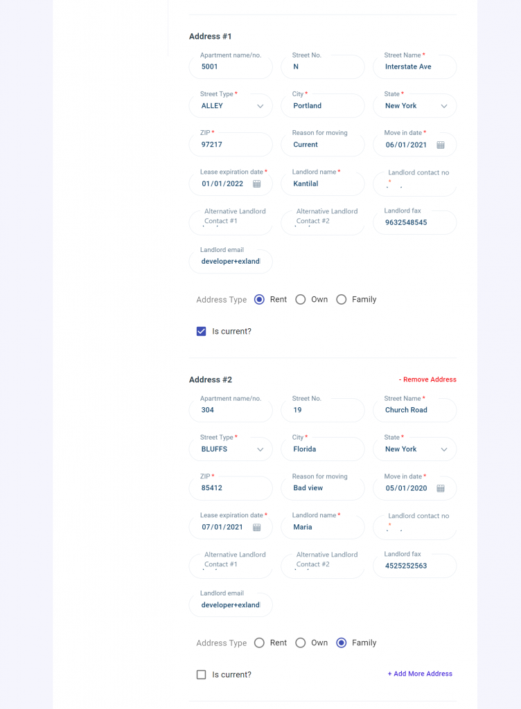 2. Address: Fill in current and previous address details. Must include full address, lease expiration date, landlord information and address type.
