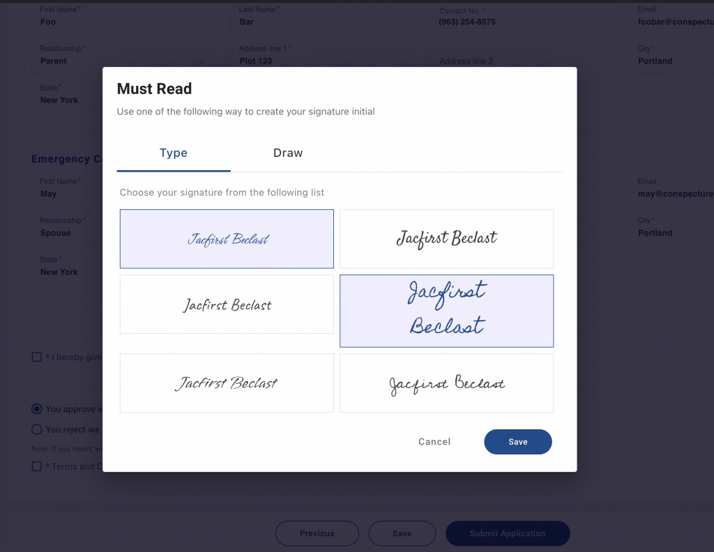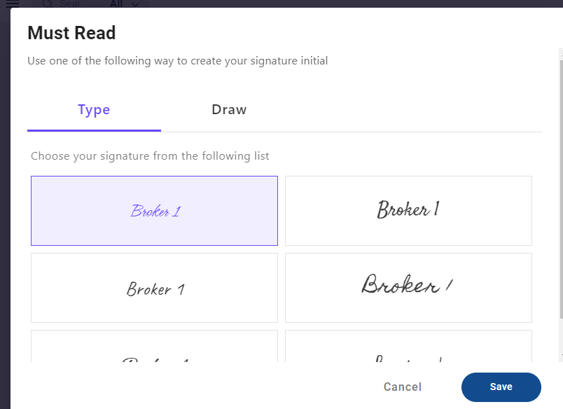 - When the box is checked, a pop up will open to create a signature by selecting or drawing a signature. Click Save to sign.
