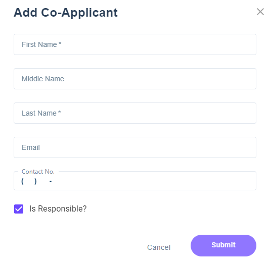 - Click on Add Co-Applicant. Add co-applicant information shown below. Check if the co-applicant is a responsible party. Note: If box is left unchecked then date of birth will be asked to be considered as a minor. Then click Submit. Upon submission the co-applicant will receive an email to complete their portion of the application.