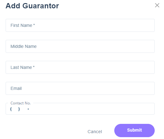 - Click on Add Guarantor, add information as seen below, then click Submit. Upon submission, an email will be sent to the Guarantor to complete their portion of the application.